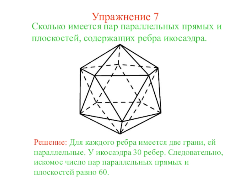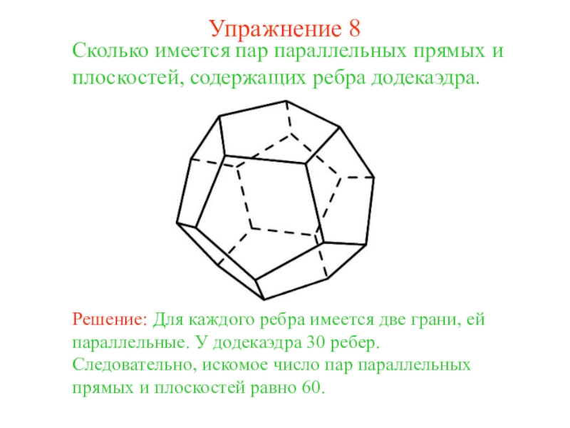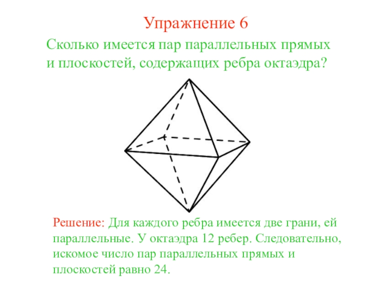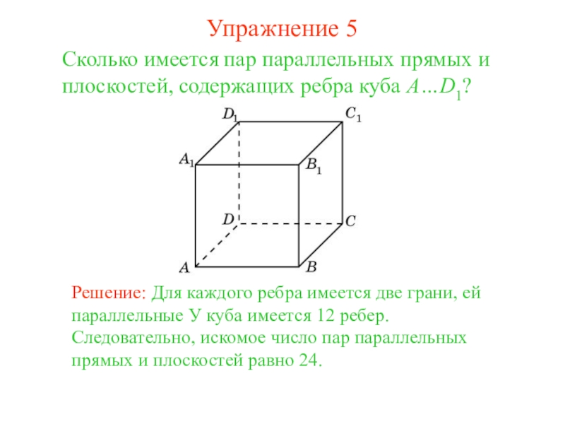 Решение: Для каждого ребра имеется две грани, ей параллельные У куба имеется 12 ребер. Следовательно, искомое число пар параллельных прямых и плоскостей равно 24.