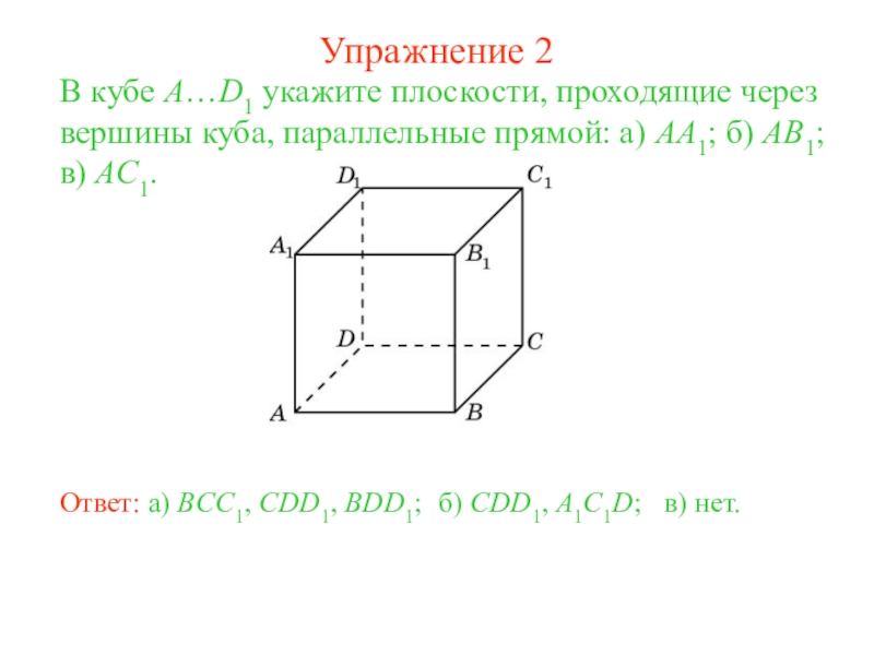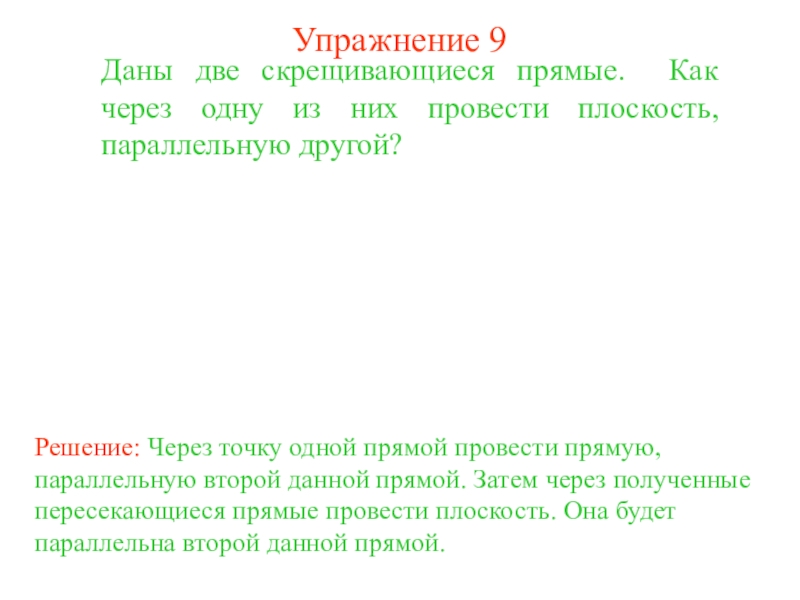 Решение: Через точку одной прямой провести прямую, параллельную второй данной прямой. Затем через полученные пересекающиеся прямые провести плоскость. Она будет параллельна второй данной прямой.