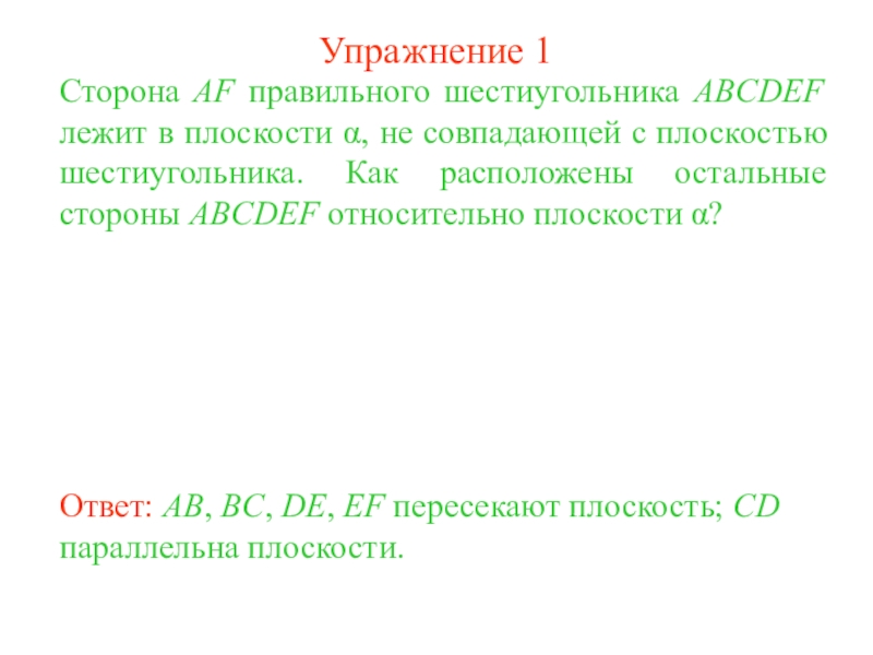 Ответ: AB, BC, DE, EF пересекают плоскость; CD параллельна плоскости.