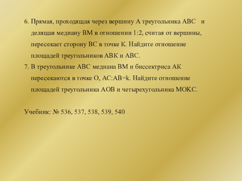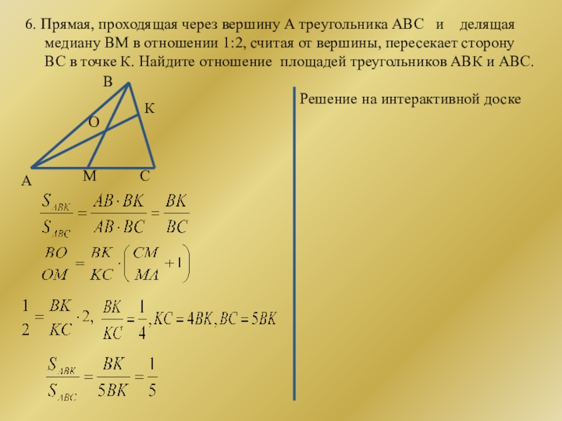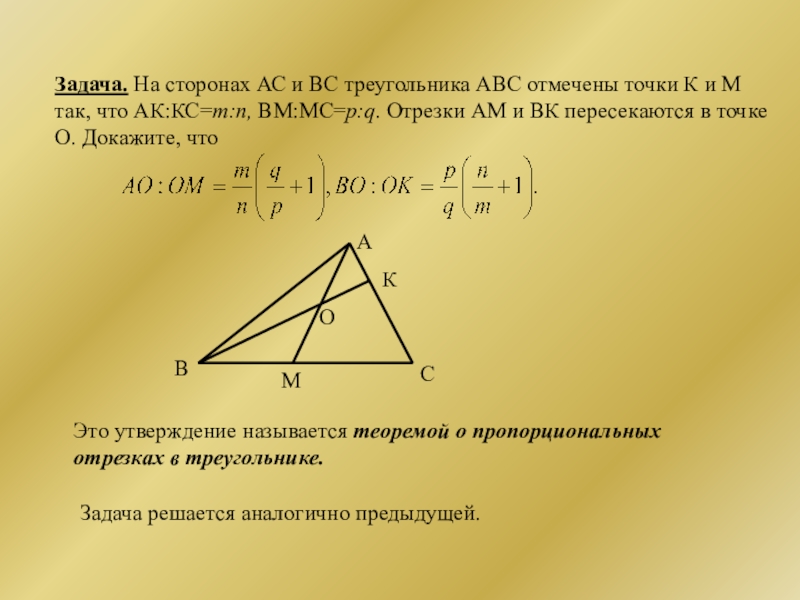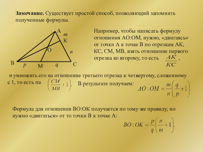 Формула для отношения ВО:ОК получается по тому же правилу, но нужно «двигаться» от то точки В к точке А: