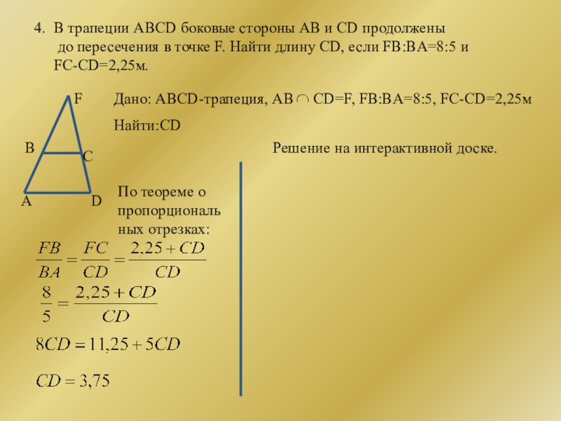 Дано: АВСD-трапеция, АВ СD=F, FB:BA=8:5, FC-CD=2,25м