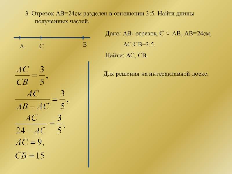Отрезок АВ=24см разделен в отношении 3:5. Найти длины