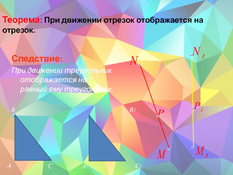 Теорема: При движении отрезок отображается на отрезок.Следствие:При движении треугольник отображается на равный ему треугольник.М N Р АBCA1B1C1