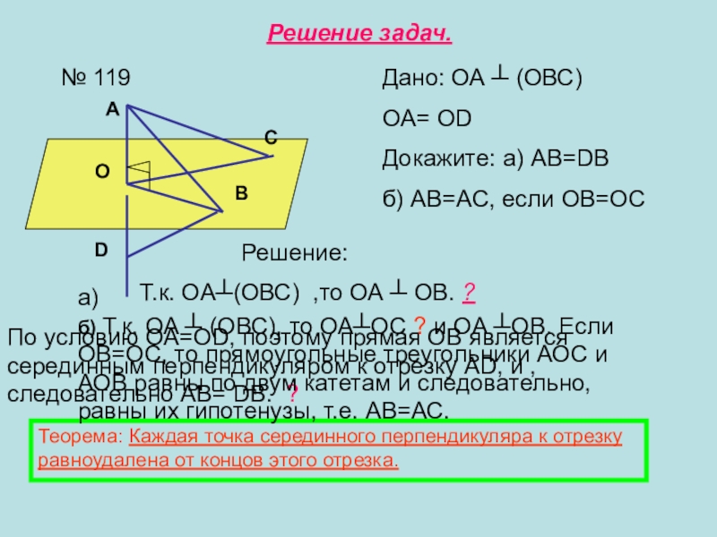 б) Т.к. ОА ┴ (ОВС), то ОА┴ОС ? и ОА ┴ОВ. Если ОВ=ОС, то прямоугольные треугольники АОС и АОВ равны по двум катетам и следовательно, равны их гипотенузы, т.е. АВ=АС.
