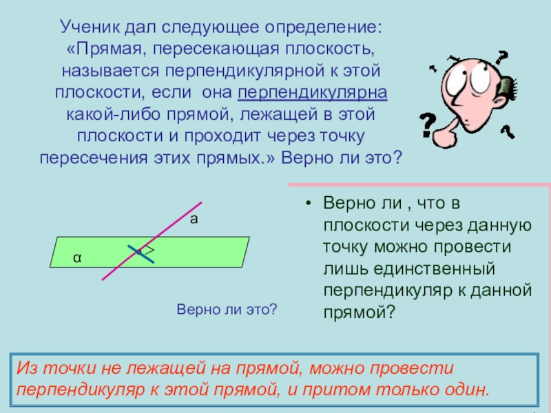 Верно ли , что в плоскости через данную точку можно провести лишь единственный перпендикуляр к данной прямой?