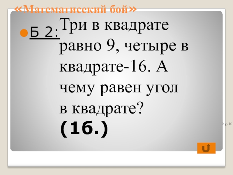 «Математисекий бой»Б 2:Три в квадрате равно 9, четыре в квадрате-16. А чему равен угол в квадрате? (1б.)