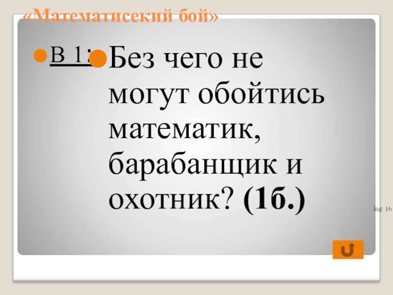 «Математисекий бой»В 1:Без чего не могут обойтись математик, барабанщик и охотник? (1б.)