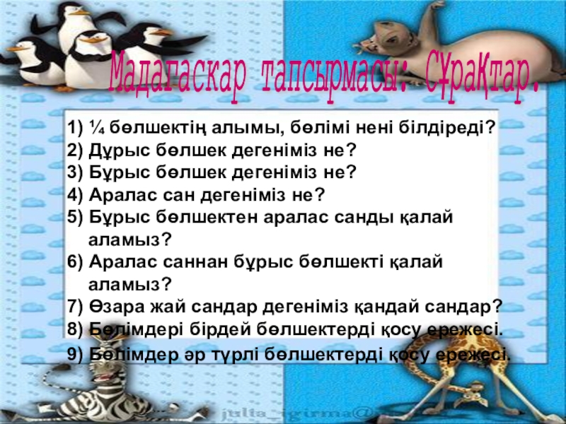 Слайд 5Мадагаскар тапсырмасы: Сұрақтар.