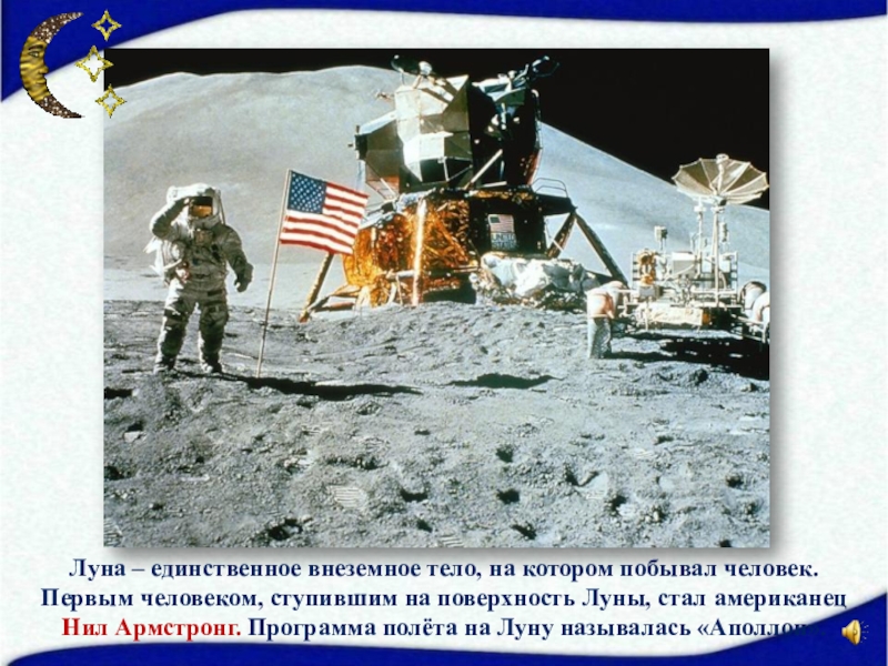 Луна – единственное внеземное тело, на котором побывал человек.Первым человеком, ступившим на поверхность Луны, стал американец Нил