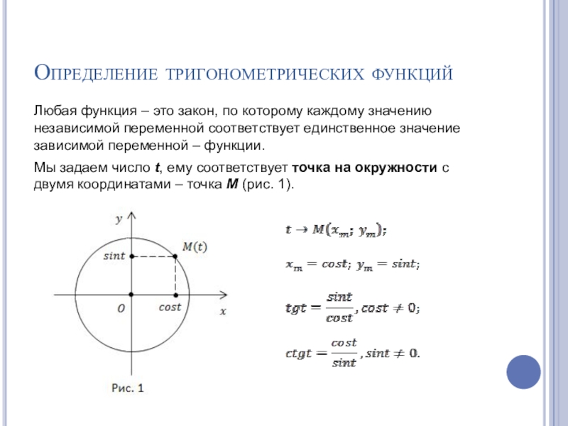Определение тригонометрических функцийЛюбая функция – это закон, по которому каждому значению независимой переменной соответствует единственное значение зависимой переменной – функции.Мы задаем число t, ему соответствует точка на окружности c двумя координатами – точка M (рис. 1).
