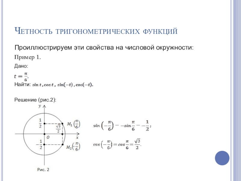 Четность тригонометрических функцийПроиллюстрируем эти свойства на числовой окружности:Пример 1.Дано:								Найти:  Решение (рис.2):