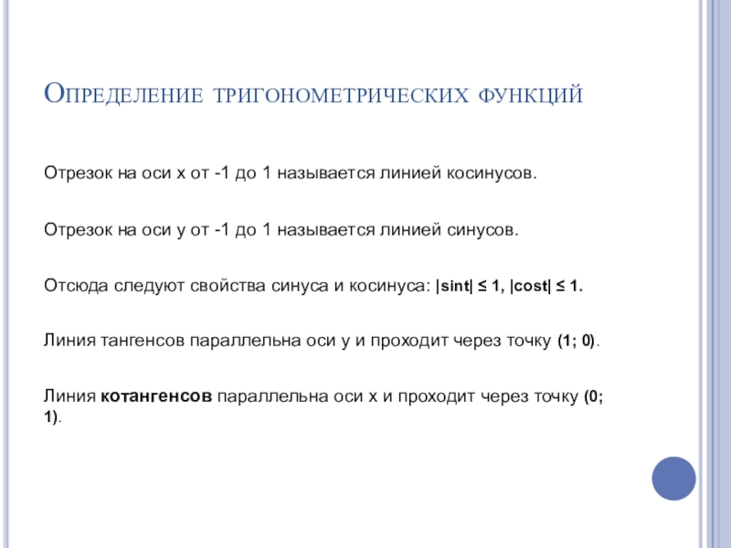 Определение тригонометрических функцийОтрезок на оси x от -1 до 1 называется линией косинусов.Отрезок на оси y от