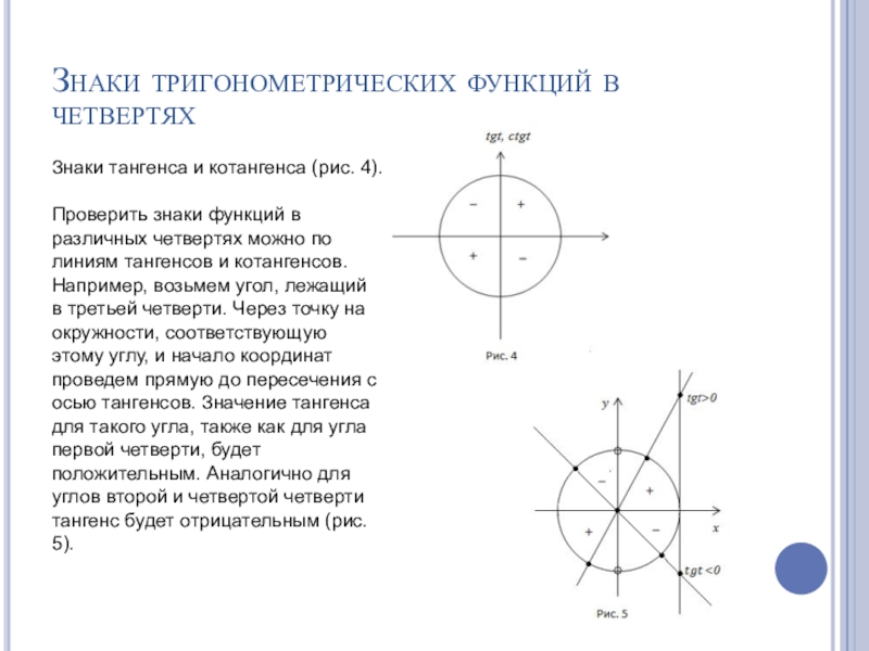Знаки тригонометрических функций в четвертяхЗнаки тангенса и котангенса (рис. 4).  Проверить знаки функций в различных четвертях