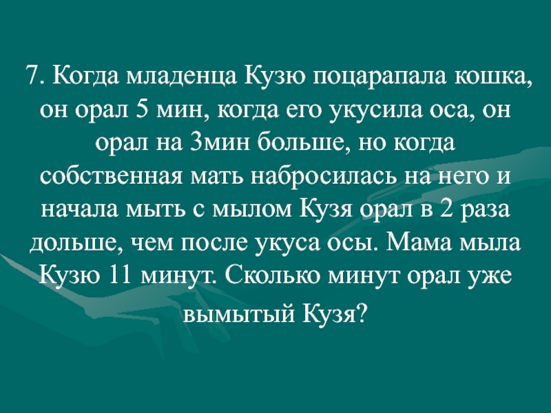 Слайд 577. Когда младенца Кузю поцарапала кошка, он орал 5 мин, когда