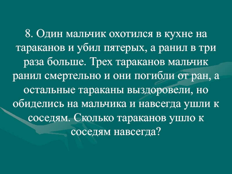 а ранил в три раза больше. Трех тараканов мальчик ранил смертельно и они погибли от ран, а остальные тараканы выздоровели, но обиделись на мальчика и навсегда ушли к соседям. Сколько тараканов ушло к соседям навсегда?