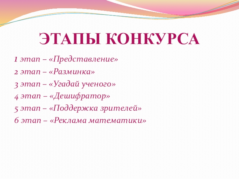 ЭТАПЫ КОНКУРСА1 этап – «Представление»2 этап – «Разминка»3 этап – «Угадай ученого»4 этап – «Дешифратор»5 этап –