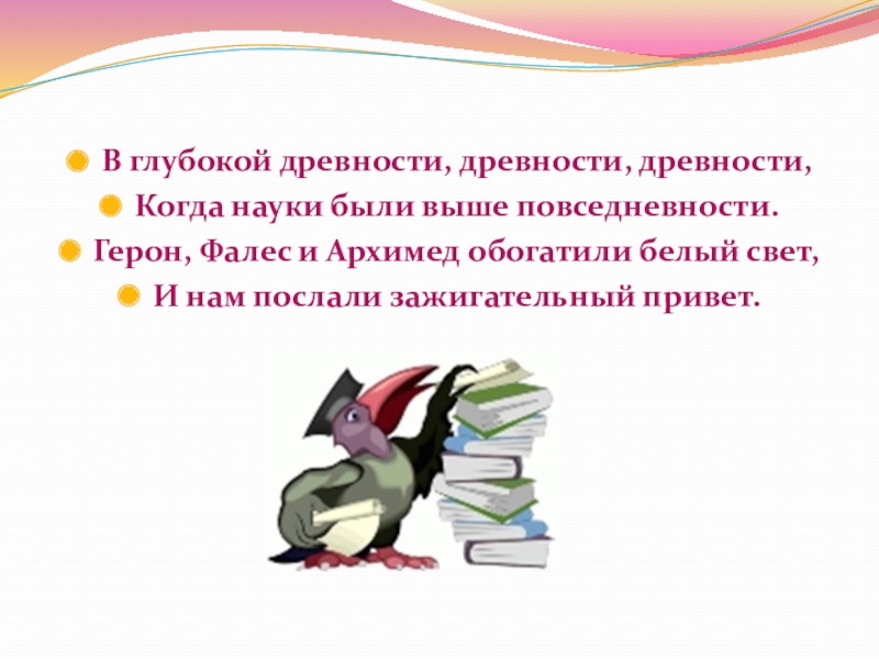 В глубокой древности, древности, древности,Когда науки были выше повседневности.Герон, Фалес и Архимед обогатили белый свет,И нам послали зажигательный привет.
