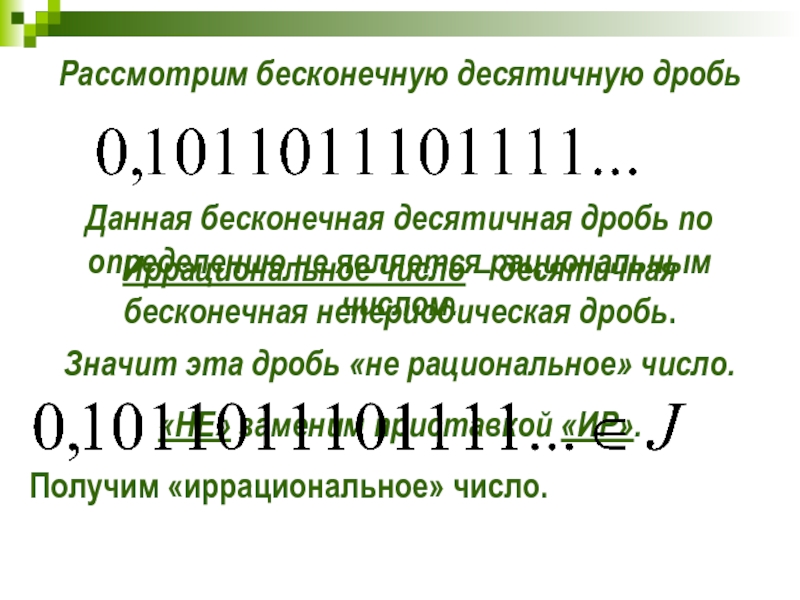 Иррациональное число – десятичная бесконечная непериодическая дробь.
