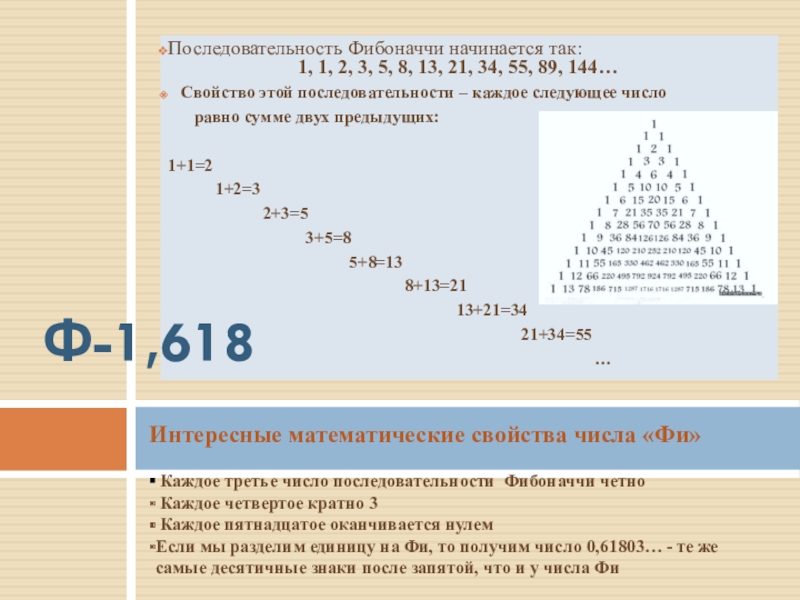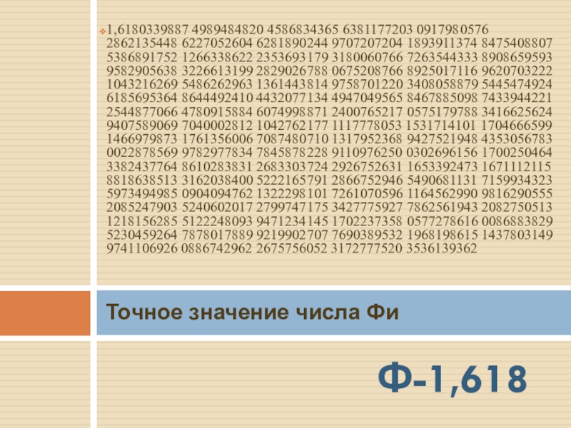 Если мы разделим единицу на Фи, то получим число 0,61803… - те же самые десятичные знаки после запятой, что и у числа Фи