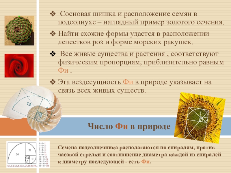 Сосновая шишка и расположение семян в подсолнухе – наглядный пример золотого сечения.