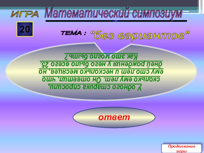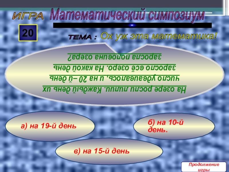 На озере росли лилии. Каждый день их число удваивалось, и на 20 –й день заросло всё озеро. На какой день заросла половина озера?