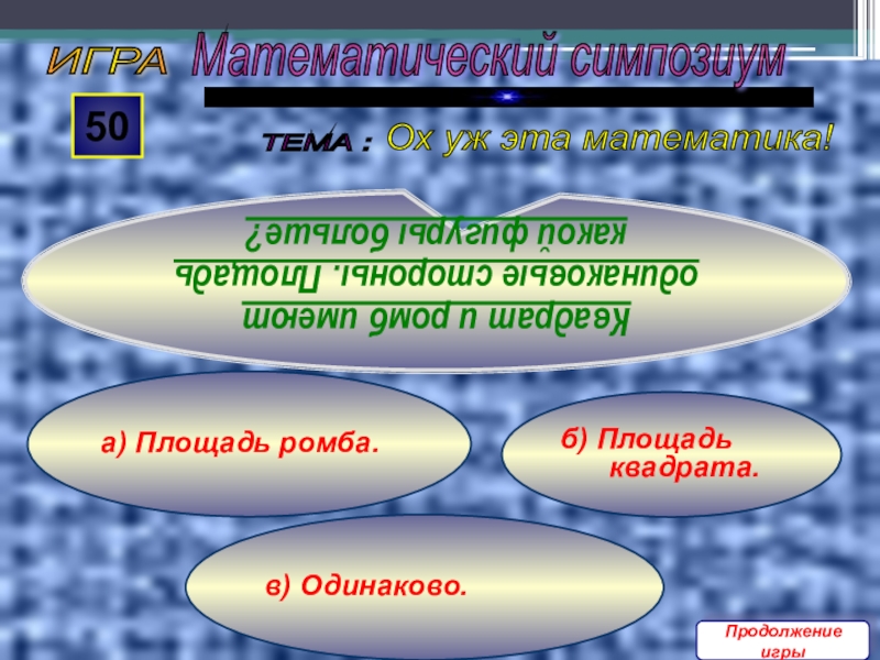 Квадрат и ромб имеют одинаковые стороны. Площадь какой фигуры больше?
