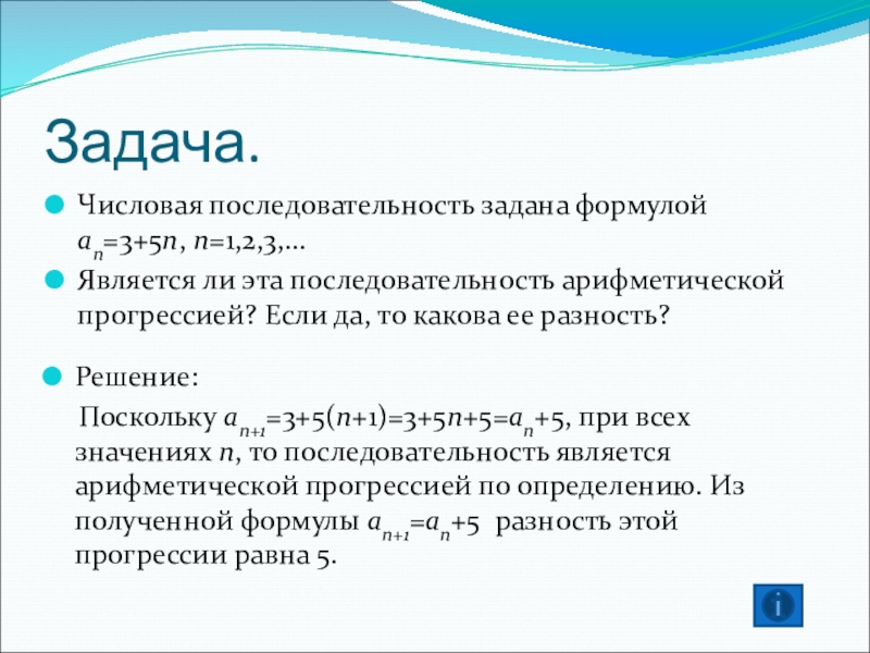 Поскольку an+1=3+5(n+1)=3+5n+5=an+5, при всех значениях n, то последовательность является арифметической прогрессией по определению. Из полученной формулы an+1=an+5 разность этой прогрессии равна 5.