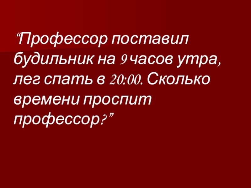 Слайд 2“Профессор поставил будильник на 9 часов утра, лег спать в 20:00.