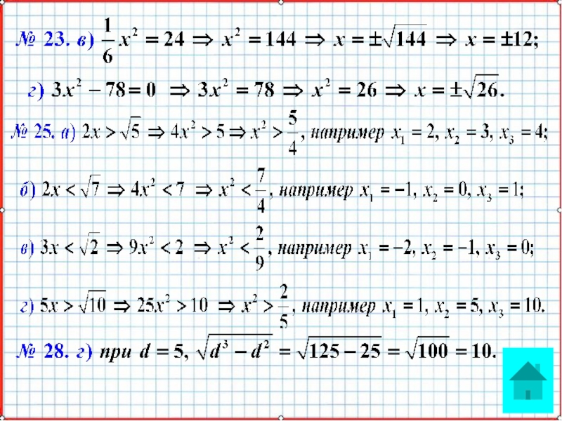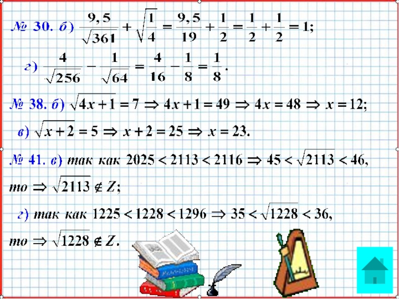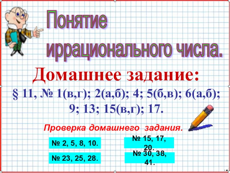 Понятие иррационального числа.Домашнее задание:§ 11, № 1(в,г); 2(а,б); 4; 5(б,в); 6(а,б); 9; 13; 15(в,г); 17. Проверка домашнего задания.№ 23, 25, 28.№ 30, 38, 41.№ 2, 5, 8, 10.№ 15, 17, 20.