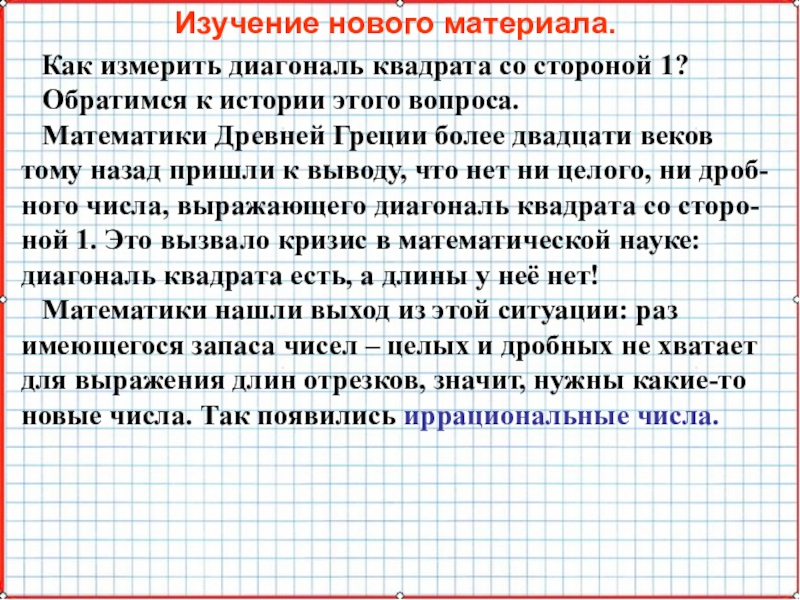 Изучение нового материала.  Как измерить диагональ квадрата со стороной 1?  Обратимся к истории этого вопроса.