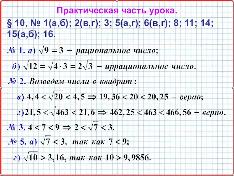 Практическая часть урока. § 10, № 1(а,б); 2(в,г); 3; 5(а,г); 6(в,г); 8; 11; 14; 15(а,б); 16.