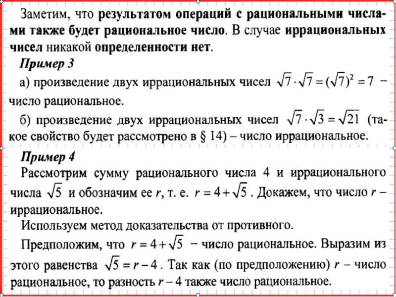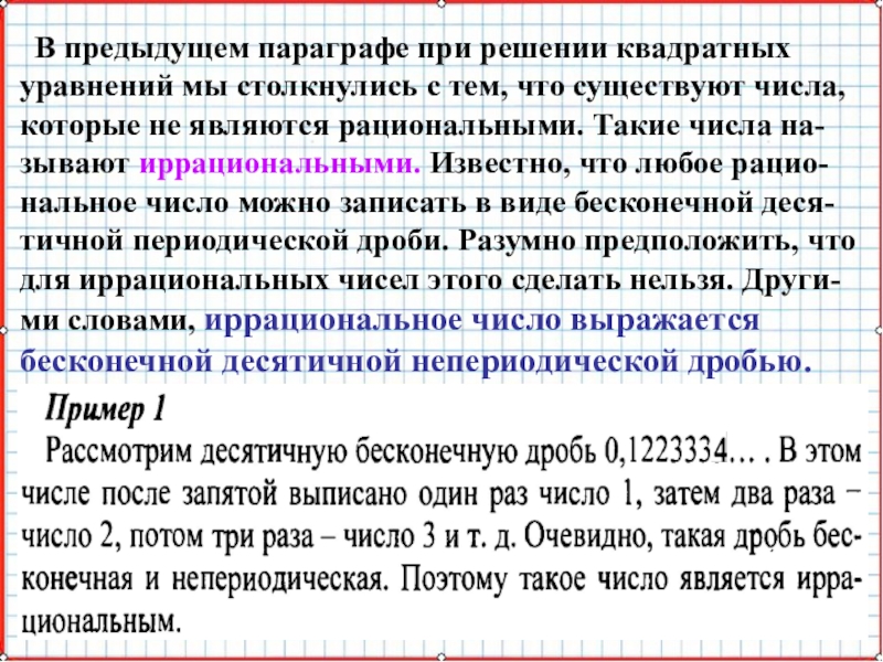 тем, что существуют числа, которые не являются рациональными. Такие числа на-зывают иррациональными. Известно, что любое рацио-нальное число можно записать в виде бесконечной деся-тичной периодической дроби. Разумно предположить, что для иррациональных чисел этого сделать нельзя. Други-ми словами, иррациональное число выражается бесконечной десятичной непериодической дробью.