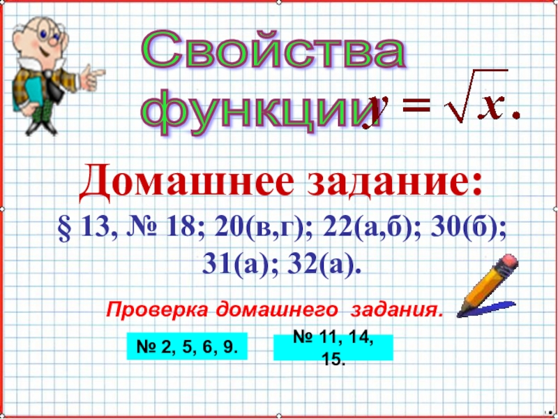 Свойства функции Домашнее задание:§ 13, № 18; 20(в,г); 22(а,б); 30(б);31(а); 32(а). Проверка домашнего задания.№ 2, 5, 6, 9.№ 11, 14, 15.
