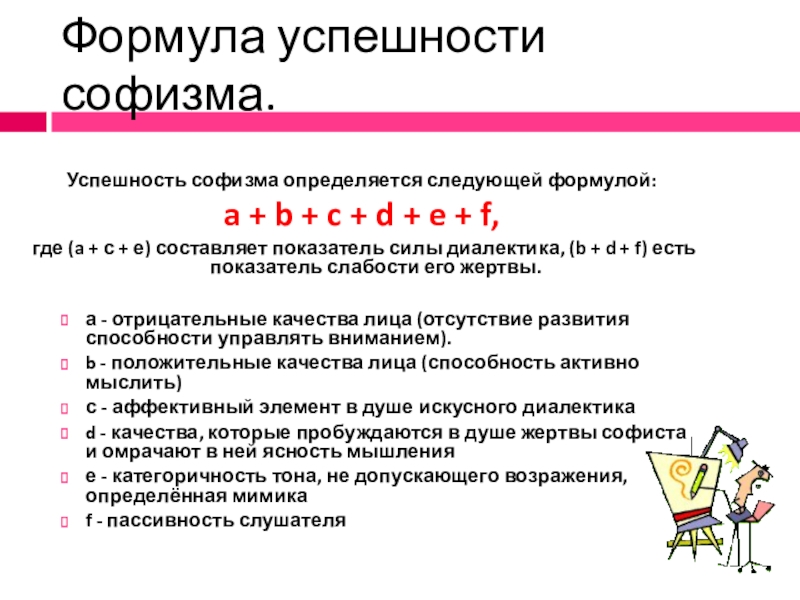 где (a + с + е) составляет показатель силы диалектика, (b + d + f) есть показатель слабости его жертвы.