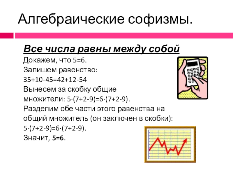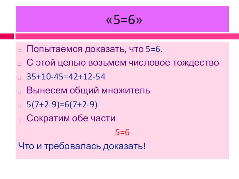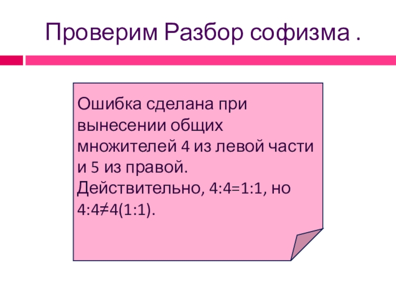 из каждой части тождества общие множители за скобки, получаем: 4(1:1)=5(1:1) или 2*2=5 Так как 1:1=1 , то сократим и получим. Где ошибка?