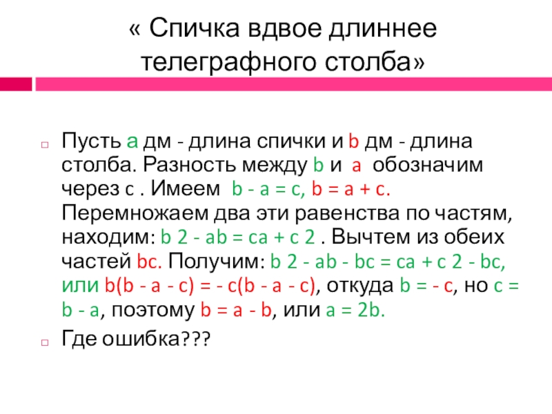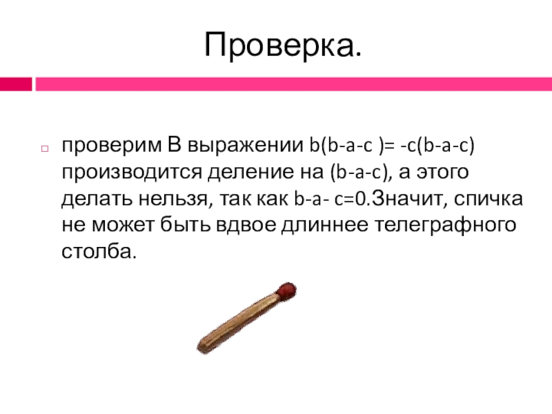 этого делать нельзя, так как b-a- c=0.Значит, спичка не может быть вдвое длиннее телеграфного столба.