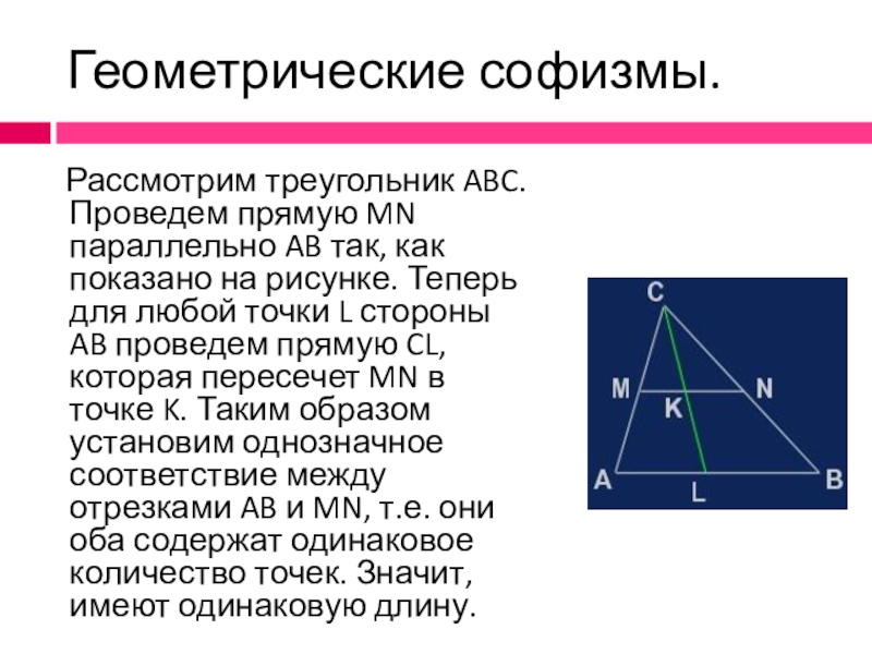 так, как показано на рисунке. Теперь для любой точки L стороны AB проведем прямую CL, которая пересечет MN в точке K. Таким образом установим однозначное соответствие между отрезками AB и MN, т.е. они оба содержат одинаковое количество точек. Значит, имеют одинаковую длину.