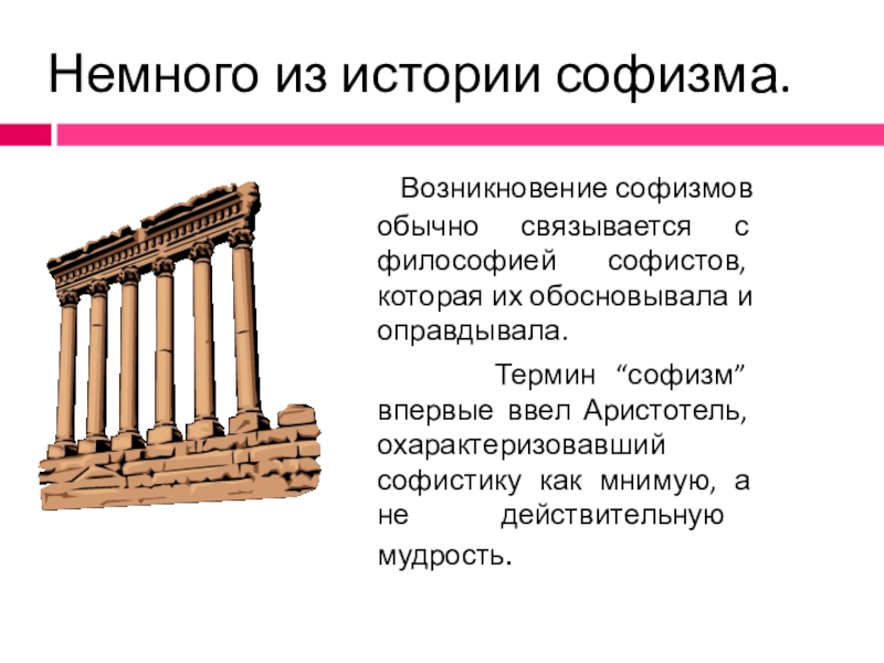 Термин “софизм” впервые ввел Аристотель, охарактеризовавший софистику как мнимую, а не действительную мудрость.