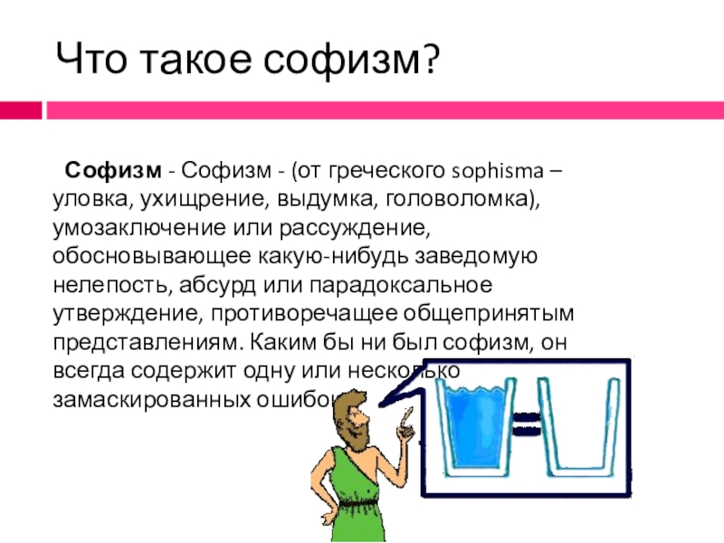 греческого sophisma – уловка, ухищрение, выдумка, головоломка), умозаключение или рассуждение, обосновывающее какую-нибудь заведомую нелепость, абсурд или парадоксальное утверждение, противоречащее общепринятым представлениям. Каким бы ни был софизм, он всегда содержит одну или несколько замаскированных ошибок.