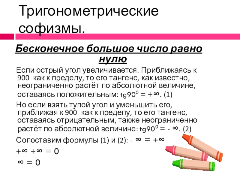 Приближаясь к 900 как к пределу, то его тангенс, как известно, неограниченно растёт по абсолютной величине, оставаясь положительным: tg900 = +∞. (1)