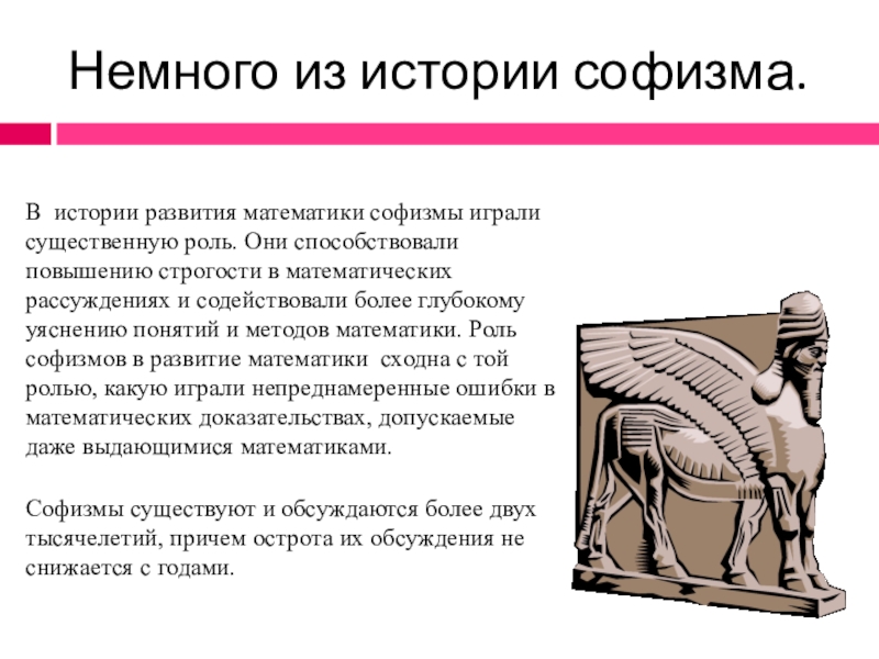 В истории развития математики софизмы играли существенную роль. Они способствовали повышению строгости в математических рассуждениях и содействовали более глубокому уяснению понятий и методов математики. Роль софизмов в развитие математики сходна с той ролью, какую играли непреднамеренные ошибки в математических доказательствах, допускаемые даже выдающимися математиками.