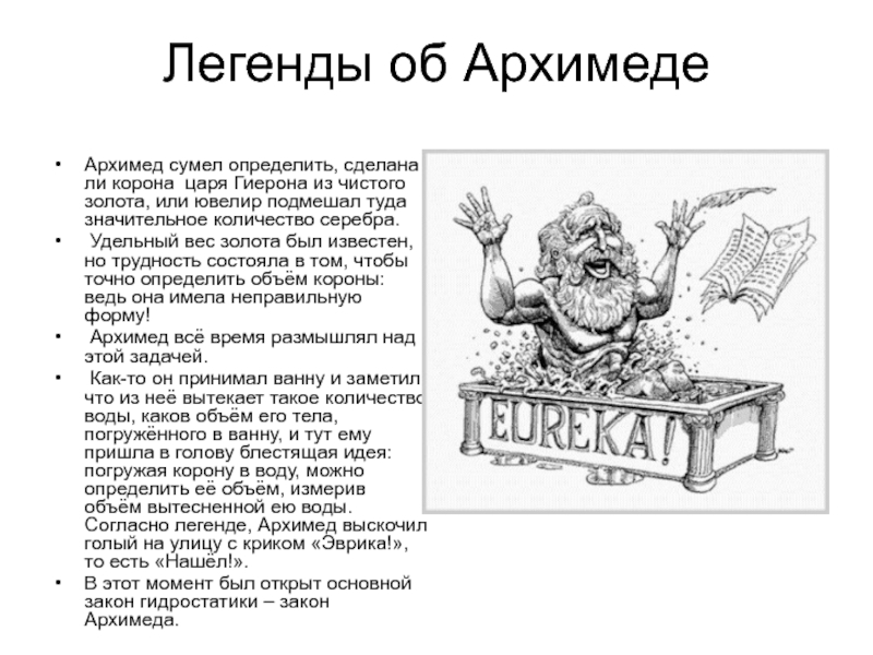 Как-то он принимал ванну и заметил, что из неё вытекает такое количество воды, каков объём его тела, погружённого в ванну, и тут ему пришла в голову блестящая идея: погружая корону в воду, можно определить её объём, измерив объём вытесненной ею воды. Согласно легенде, Архимед выскочил голый на улицу с криком «Эврика!», то есть «Нашёл!».