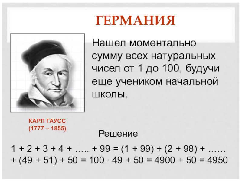 1 + 2 + 3 + 4 + ….. + 99 = (1 + 99) + (2 + 98) + …… + (49 + 51) + 50 = 100 ∙ 49 + 50 = 4900 + 50 = 4950
