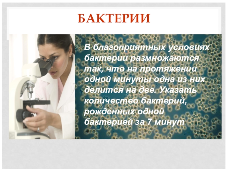 В благоприятных условиях бактерии размножаются так, что на протяжении одной минуты одна из них делится на две. Указать количество бактерий, рожденных одной бактерией за 7 минут