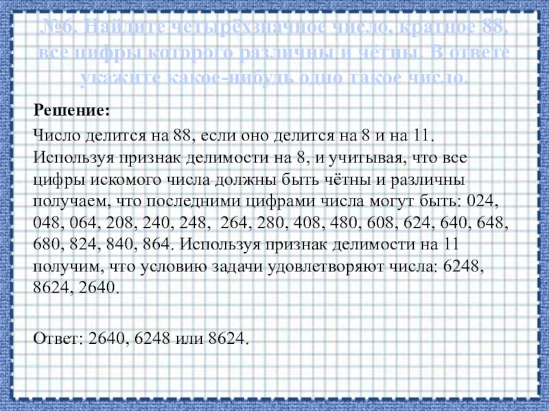 Число делится на 88, если оно делится на 8 и на 11. Используя признак делимости на 8, и учитывая, что все цифры искомого числа должны быть чётны и различны получаем, что последними цифрами числа могут быть: 024, 048, 064, 208, 240, 248, 264, 280, 408, 480, 608, 624, 640, 648, 680, 824, 840, 864. Используя признак делимости на 11 получим, что условию задачи удовлетворяют числа: 6248, 8624, 2640.