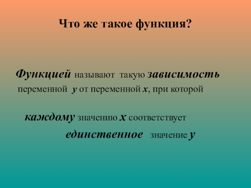 Что же такое функция?Функцией называют такую зависимость переменной у от переменной х, при которой 					  каждому