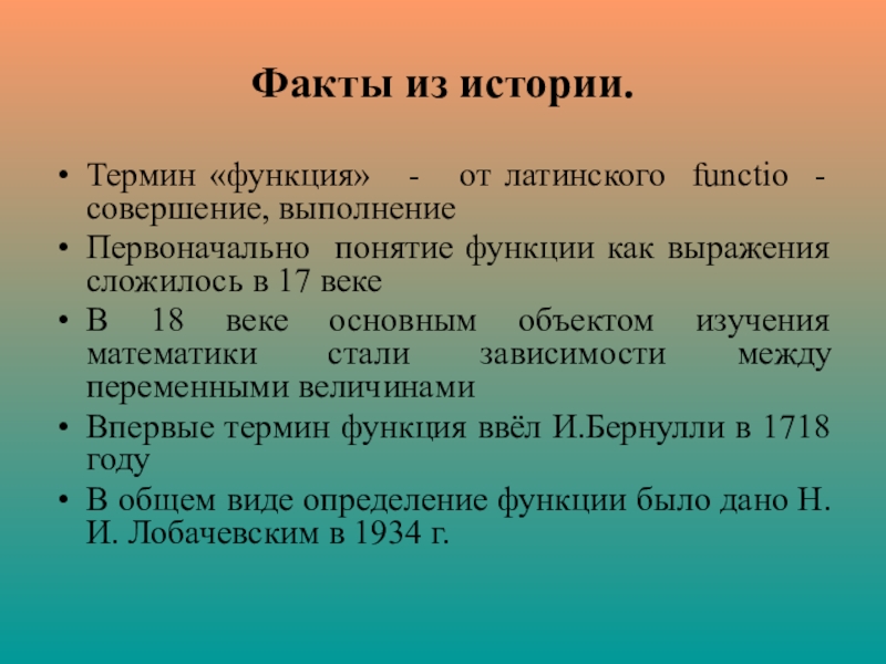 Факты из истории.Термин «функция»  -  от латинского functio - совершение, выполнениеПервоначально понятие функции как выражения