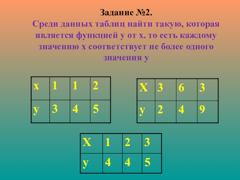 Слайд 9Задание №2. Среди данных таблиц найти такую, которая является функцией у от