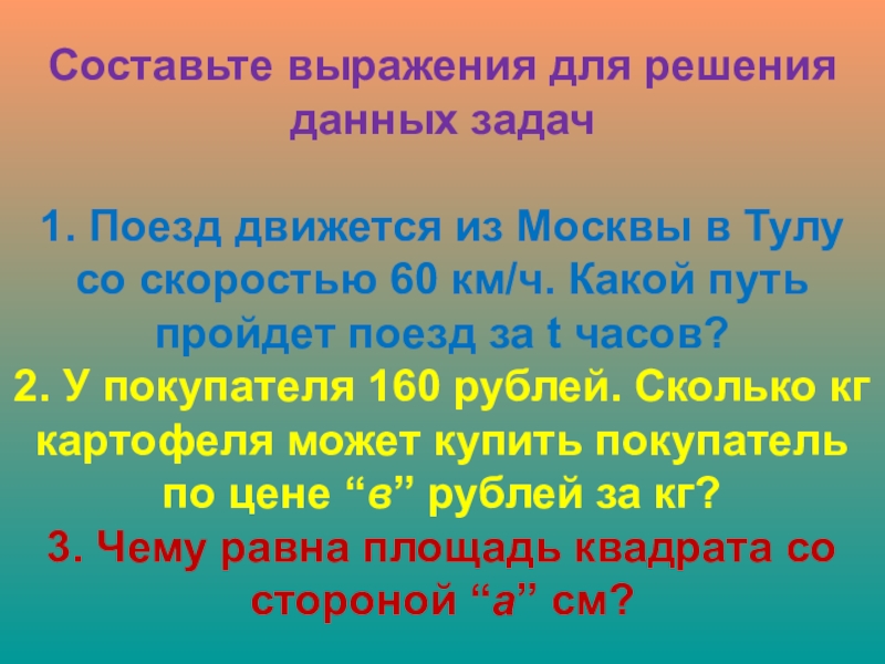 Тулу со скоростью 60 км/ч. Какой путь пройдет поезд за t часов? 2. У покупателя 160 рублей. Сколько кг картофеля может купить покупатель по цене “в” рублей за кг? 3. Чему равна площадь квадрата со стороной “а” см?