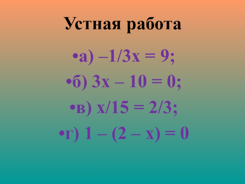 Устная работаа) –1/3х = 9; б) 3х – 10 = 0; в) х/15 = 2/3;г) 1 – (2 – х) = 0